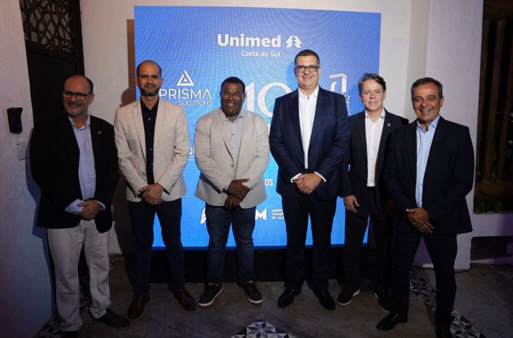 A placa de homenagem foi entregue pelo nosso presidente Frederico Barreto ao Superintendente de Mercado da Unimed Costa do Sol, Amaury Gama Marques. Marco Costa, Gerente de Negócios, e Uelington Emerick, Consultor de Vendas da Unimed Costa do Sol, também participaram do evento.